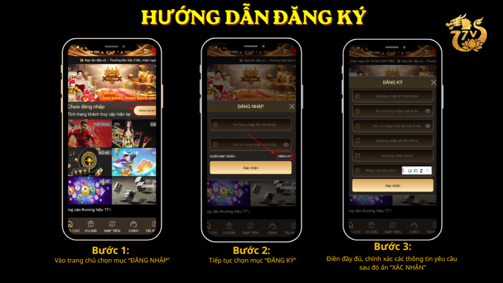 Sau đó bấm “XÁC NHẬN“. Hệ thống sẽ kiểm tra đối chiếu thông tin đăng ký của quý khách ngay lập tức nếu mọi thông tin đều hợp lệ hệ thống sẽ thông báo đăng ký tài khoản thành công và quý khách sẽ quay về trang chủ của 77v.com sẵn sàng trải nghiệm tất cả các trò chơi giải trí cá cược trực tuyến hấp dẫn trên nền tảng của chúng tôi